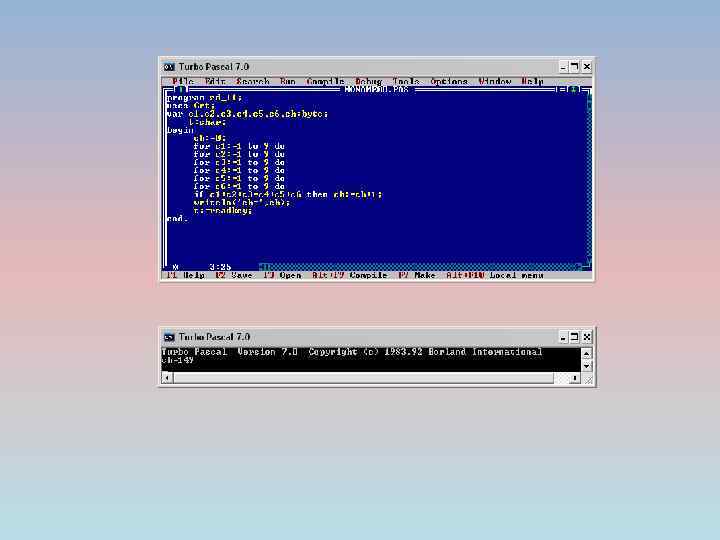 Задача № 5 Условие: Найти сумму первых десяти натуральных чисел. Исходные данные: 10 первых натуральных чисел Результат: S Решение: б) Turbo Pascal а) Блок-схема начало S: =0 j: =1 до 10 S: =S+j ‘S=‘, S конец