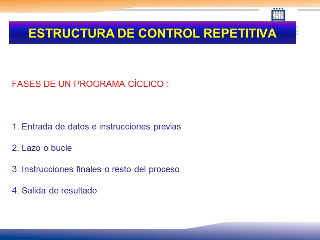 ESTRUCTURA DE CONTROL REPETITIVA FASES DE UN PROGRAMA CÍCLICO : 1. Entrada de datos e instrucciones previas 2. Lazo o bucle 3. Instrucciones finales o resto del proceso 4. Salida de resultado