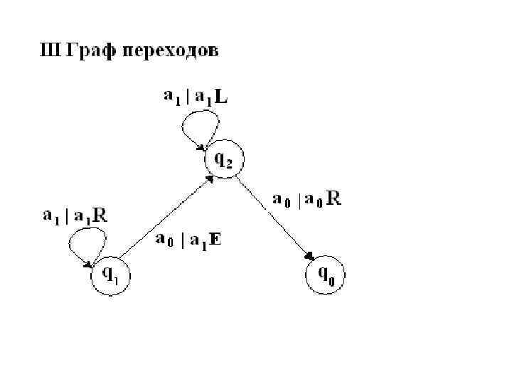 • Пример: покажем, как можно воспользоваться командой условного перехода для организации циклического процесса. Пусть на ленте имеется запись из нескольких меток подряд, и головка находится над самой крайней меткой справа. Требуется перевести головку влево до первой пустой позиции.