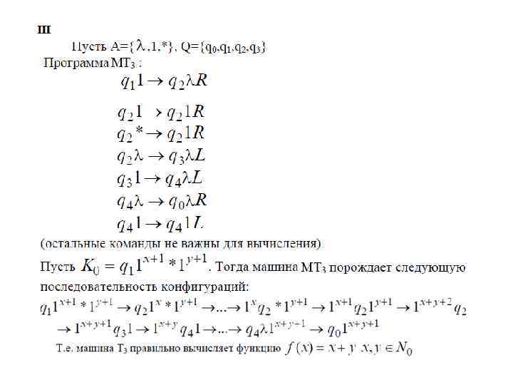 Нужно увеличить число 3 на единицу (изменить значение в памяти с 3 на 4). Допустим, точно известно, что каретка стоит где-то слева от меток и обозревает пустую ячейку. Тогда программа увеличения числа на единицу может выглядеть так: • • • 1 -> 2 2 ? 1; 3 3 <- 4 4 V 5 5 !