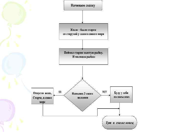 Циклический алгоритм предполагает наличие действий, выполняющихся многократно. Например, алгоритм рыбной ловли – отдельные действия в алгоритме будут повторяться.