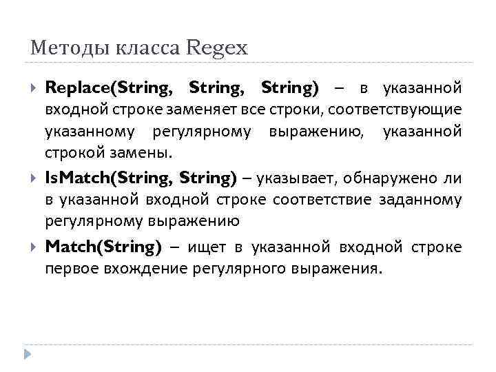Методы класса Regex Replace(String, String) – в указанной входной строке заменяет все строки, соответствующие указанному регулярному выражению, указанной строкой замены. Is. Match(String, String) – указывает, обнаружено ли в указанной входной строке соответствие заданному регулярному выражению Match(String) – ищет в указанной входной строке первое вхождение регулярного выражения.