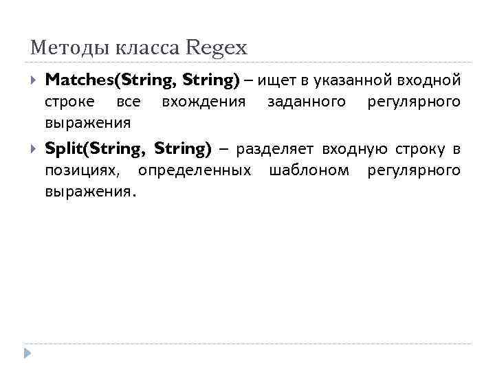 Методы класса Regex Matches(String, String) – ищет в указанной входной строке все вхождения заданного регулярного выражения Split(String, String) – разделяет входную строку в позициях, определенных шаблоном регулярного выражения.