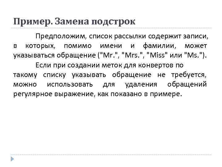 Пример. Замена подстрок Предположим, список рассылки содержит записи, в которых, помимо имени и фамилии, может указываться обращение ("Mr. ", "Mrs. ", "Miss" или "Ms. "). Если при создании меток для конвертов по такому списку указывать обращение не требуется, можно использовать для удаления обращений регулярное выражение, как показано в примере.