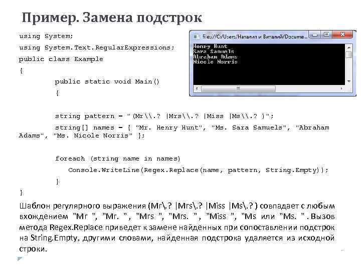Пример. Замена подстрок using System; using System. Text. Regular. Expressions; public class Example { public static void Main() { string pattern = "(Mr\. ? |Mrs\. ? |Miss |Ms\. ? )"; string[] names = { "Mr. Henry Hunt", "Ms. Sara Samuels", "Abraham Adams", "Ms. Nicole Norris" }; foreach (string name in names) Console. Write. Line(Regex. Replace(name, pattern, String. Empty)); } } Шаблон регулярного выражения (Mr. ? |Mrs. ? |Miss |Ms. ? ) совпадает с любым вхождением "Mr ", "Mr. " , "Mrs ", "Mrs. " , "Miss ", "Ms или "Ms. ". Вызов метода Regex. Replace приведет к замене найденных при сопоставлении подстрок на String. Empty, другими словами, найденная подстрока удаляется из исходной строки.