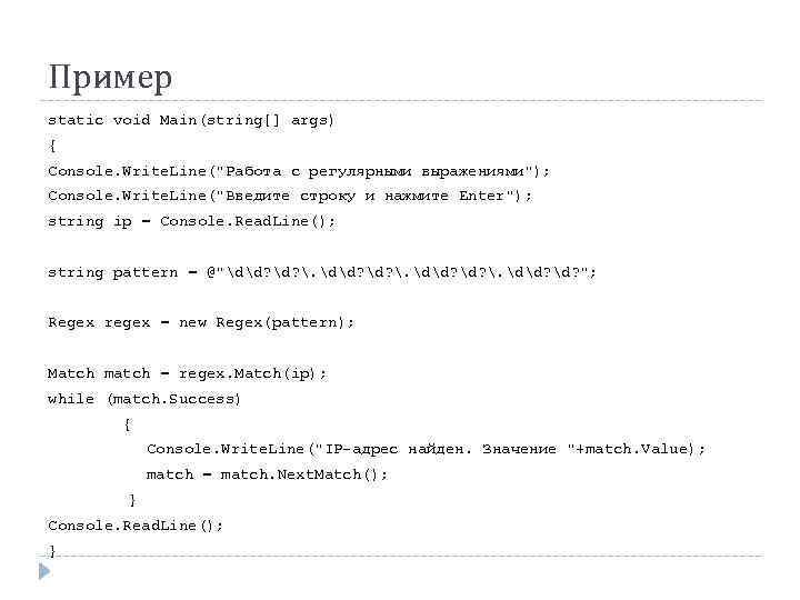 Пример static void Main(string[] args) { Console. Write. Line("Работа с регулярными выражениями"); Console. Write. Line("Введите строку и нажмите Enter"); string ip = Console. Read. Line(); string pattern = @"dd? d? . dd? "; Regex regex = new Regex(pattern); Match match = regex. Match(ip); while (match. Success) { Console. Write. Line("IP-адрес найден. Значение "+match. Value); match = match. Next. Match(); } Console. Read. Line(); }