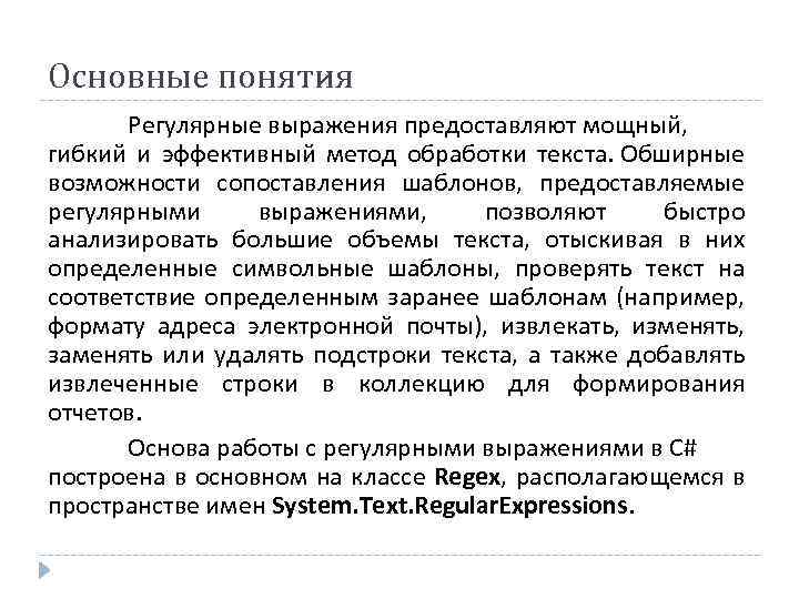 Основные понятия Регулярные выражения предоставляют мощный, гибкий и эффективный метод обработки текста. Обширные возможности сопоставления шаблонов, предоставляемые регулярными выражениями, позволяют быстро анализировать большие объемы текста, отыскивая в них определенные символьные шаблоны, проверять текст на соответствие определенным заранее шаблонам (например, формату адреса электронной почты), извлекать, изменять, заменять или удалять подстроки текста, а также добавлять извлеченные строки в коллекцию для формирования отчетов. Основа работы с регулярными выражениями в C# построена в основном на классе Regex, располагающемся в пространстве имен System. Text. Regular. Expressions.