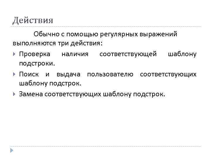 Действия Обычно с помощью регулярных выражений выполняются три действия: Проверка наличия соответствующей шаблону подстроки. Поиск и выдача пользователю соответствующих шаблону подстрок. Замена соответствующих шаблону подстрок.