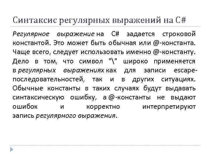Синтаксис регулярных выражений на С# Регулярное выражение на C# задается строковой константой. Это может быть обычная или @-константа. Чаще всего, следует использовать именно @-константу. Дело в том, что символ "" широко применяется в регулярных выражениях как для записи escapeпоследовательностей, так и в других ситуациях. Обычные константы в таких случаях будут выдавать синтаксическую ошибку, а @-константы не выдают ошибок и корректно интерпретируют запись регулярного выражения.