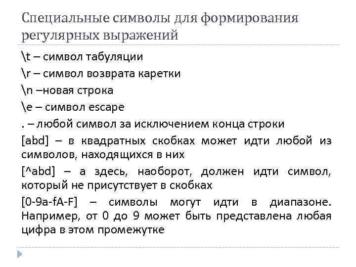 Специальные символы для формирования регулярных выражений t – символ табуляции r – символ возврата каретки n –новая строка e – символ escape. – любой символ за исключением конца строки [abd] – в квадратных скобках может идти любой из символов, находящихся в них [^abd] – а здесь, наоборот, должен идти символ, который не присутствует в скобках [0 -9 a-f. A-F] – символы могут идти в диапазоне. Например, от 0 до 9 может быть представлена любая цифра в этом промежутке