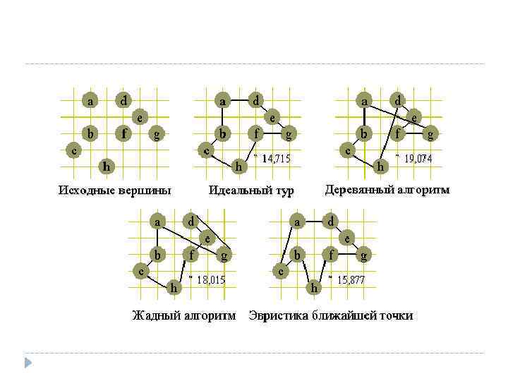 Алгоритм Литтла Таким образом, вершин не осталось, перебор завершен. А найденное в ходе него рекордное значение и соответствующий ему тур — решение задачи. Удовлетворительных теоретических оценок алгоритма Литтла и ему подобных нет, но практика показывает, что на современных машинах они позволяют решать задачу коммивояжера с количеством вершин ≈ 100. Кроме того, алгоритмы типа ветвей и границ являются эффективными эвристическими процедурами. Если нет возможности доводить их до конца.