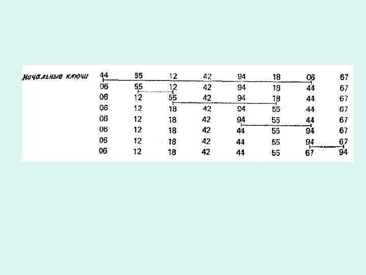 Алгоритм сортировки простыми вставками: For i: = 1 to n-1 do begin x: =a[i]; «вставить х на подходящее место в а 0. . ai-1 end При поиске подходящего места удобно чередовать сравнения и пересылки, т. е. как бы «просеивать» х, сравнивая его с очередным элементом аj и либо вставляя х, либо пересылая аj направо и продвигаясь налево. Закончиться «просеивание» может при двух различных условиях: 1. Найден элемент аj с ключом меньшим, чем ключ х. 2. Достигнут левый конец готовой последовательности.