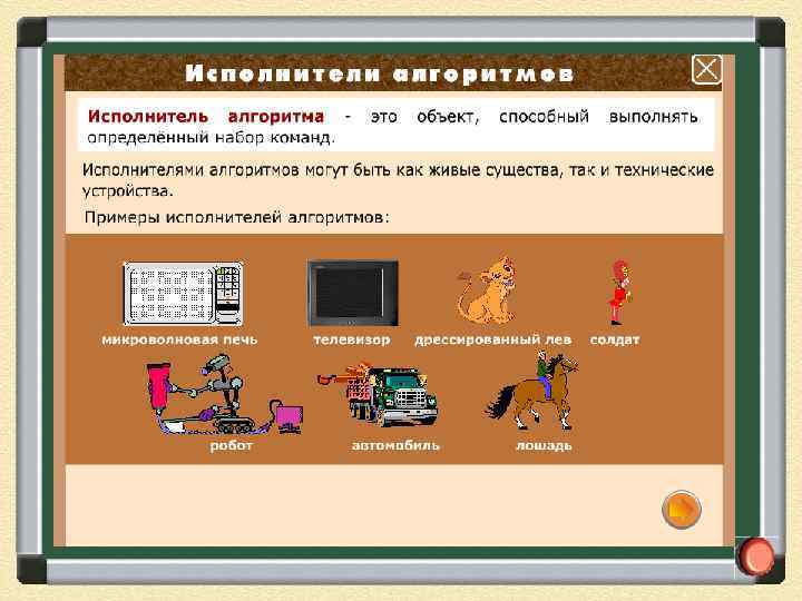 Характеристика исполнителя Исполнитель алгоритма Среда обитания Элементарные Система Отказы исполнителя действия команд исполнителя