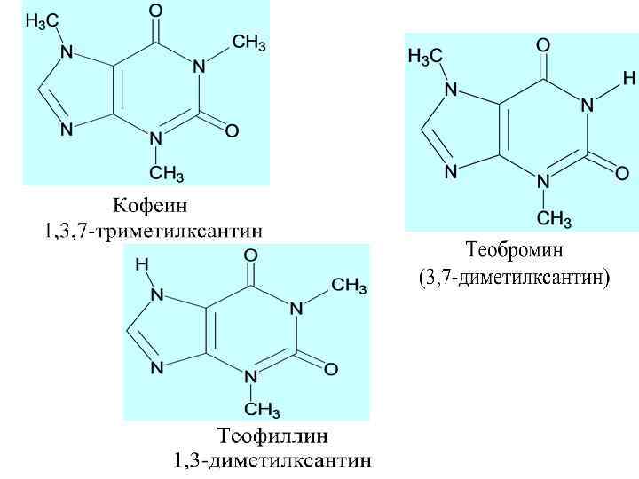 Кофеин, теофиллин, теобромин — алкалоиды группы пурина В основе лежит ядро ксантина (2, 6 -дигидроксопурин) Природные источники пуриновых алкалоидов - листья чая, зерна кофе, бобы какао