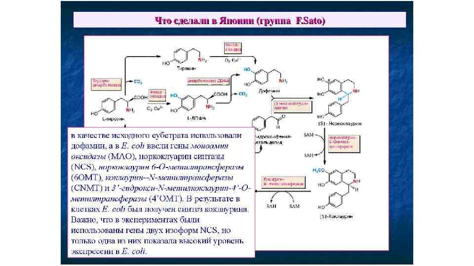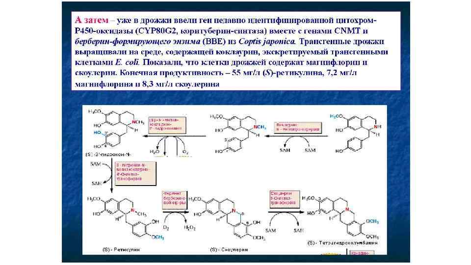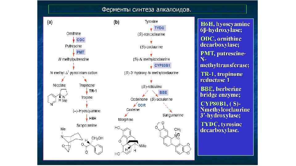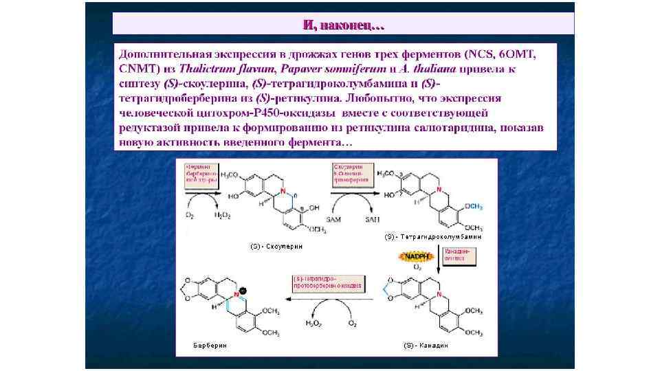 Изохинолиновые алкалоиды • В конденсации по типу реакции Манниха участвует также производное второй молекулы тирозина – гидроксифенилацетальдегид, что приводит к формированию первого бензилизохинолинового алкалоида – норкоклаурина. Затем серия О- и Nметилирований (в схеме пропущено) ведет к образованию ретикулина - ключевого интермедиата биосинтеза ди- и тетрагидроксибензилизохинолиновых алкалоидов -ретикулина. • Последний этап синтеза берберина связан с образованием 2 дополнительных колец: одного – путем окисления N-метильной группы и включением его углерода в С-8 скоулерина и второго – за счет появления метилендиоксидного моста между С-2 и С-3 у канадина. Это осуществляется в гладком эндоплазматическом ретикулуме с помощью микросомальной цитохром Р 450 -зависимой оксидазы. Конечный продукт, образование которого связано с выделением эквимолярного количества Н 2 О 2, накапливается в вакуолях. Некоторые этапы биосинтеза берберина, ферменты которого полностью идентифицированы (Croteau et al. , 2000).