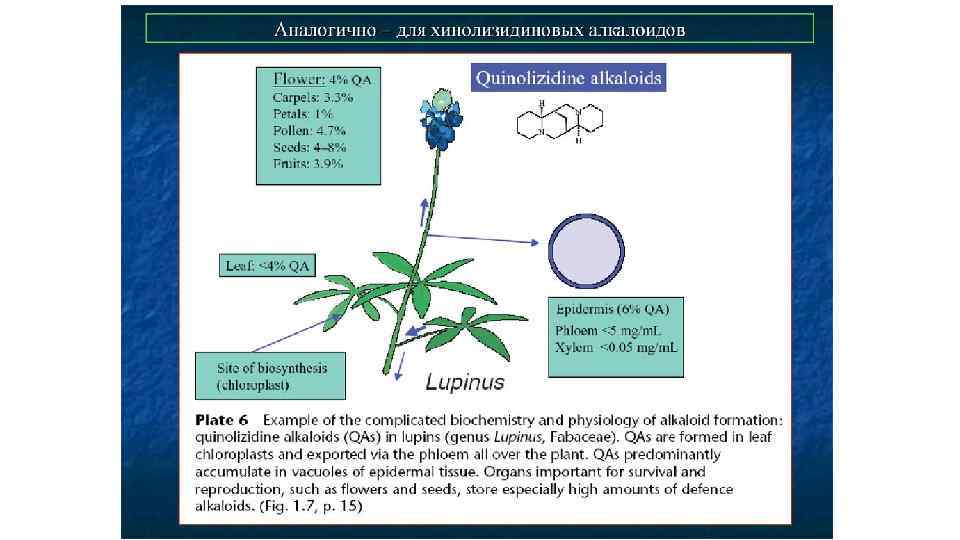 Распространение в царстве растений • Обнаружены в растениях 30 семейств. Наиб. богаты ими растения семейства анноновых (Annonaceae), барбарисовых (Berberidaceae), дымянковых (Fumariaceae), гернандиевых (Hernandiaceae), лавровых (Lauraceae), магнолиевых (Magnoliaceae), луносемянниковых (Menispermaceae), монимисвых (Monimiaceae), маковых (Papaveraceae), лютиковых (Ranunculaceae). • Включают более 1000 представителей и содержат от 10 до 42 атомов С. • Близкими к опиатным алкалоидам являются таковые (до 14 видов) чистотела большого Chelidonium majus (Маковые), млечный сок которого в отличие от опиума окрашен в желтый цвет из-за содержащегося в нем берберина. Берберин – самый распространенный в растительном мире алкалоид. Он содержится у 90 видов растений из 7 семейств, в том числе разных видов барбариса Berberis, ягоды которого использовали еще в Древней Индии и Вавилоне как кровоочистительное средство, а в настоящее время всем частям растения приписывают желчегонное, гипотензивное, сердечное, а иногда и противоопухолевое действие. • Следует отметить, что чистотел из-за присутствия в своем составе сильно токсичного алкалоида гомохелидонина в медицине используется только как наружное бактерицидное и фунгистатичное средство. Согласно нашим данным, для чистотела были характерны наибольшие дисмутагенная и мутагенная активности среди ряда 26 изученных комнатных (Aloe arborescens, Callisia fragrans) и дикорастущих (Aegopodium podagraria, Plantago major, Tussilago farfara) лекарственных растений, что, по-видимому, было обусловлено высоким содержанием веществ с противоположным типом действия – флавоноидов и алкалоидов, соответственно.