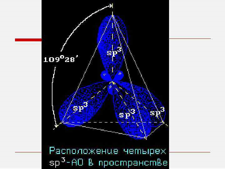 Строение алканов Каждый атом углерода в молекулах алканов находится в состоянии sp 3 -гибридизации — все 4 гибридные орбитали атома С равны по форме и энергии, 4 электронных облака направлены в вершины тетраэдра под углами 109° 28'.