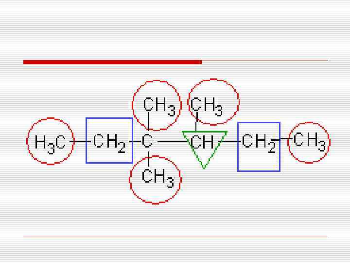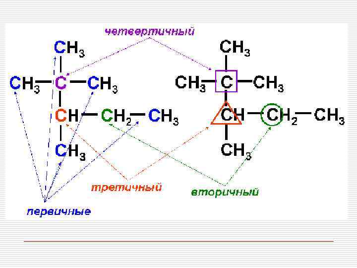 По характеру соединения атомы углерода бывают: o o первичные, соединенные с одним атомом углерода; вторичные, соединенные с двумя атомами углерода; третичные, соединенные с тремя атомами углерода; четвертичные, соединенные с четырьмя атомами углерода.