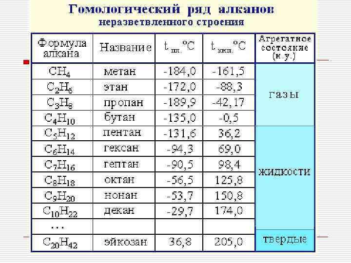 Физические свойства o Температуры плавления и кипения увеличиваются с молекулярной массой и длиной главной углеродной цепи o При нормальных условиях неразветвлённые алканы с CH 4 до C 4 H 10 — газы; с C 5 H 12 до C 13 H 28 — жидкости; после C 14 H 30 — твёрдые тела. o Температуры плавления и кипения понижаются от менее разветвленных к более разветвленным. Так, например, при 20 °C н-пентан — жидкость, а неопентан — газ.