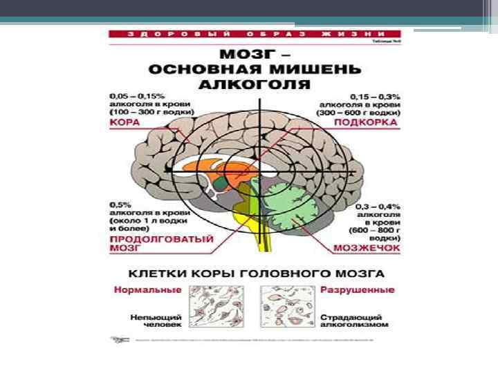 • Алкоголь — это своеобразный наркотик, и его употребление парализует многие важные функции человеческого мозга, прежде всего функцию торможения, регуляции поступков людей. В состоянии опьянения человек в значительной мере теряет способность к самоконтролю, самообладанию и в результате нередко совершает антиобщественные поступки, становится жертвой несчастных случаев. Употребление алкоголя приводит к нарушению процесса формирования личности, к ее деградации. Алкоголь расшатывает нервную систему, ослабляет силу воли, делает человека грубым, раздражительным, агрессивным. Безмерно развивается эгоизм, на первое место в жизни такого индивидуума выходит постоянное стремление к удовлетворению повышенной потребности в алкоголе.