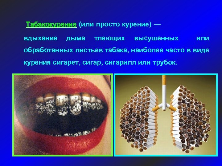 Табакокурение (или просто курение) — Табакокурение вдыхание дыма тлеющих высушенных или обработанных листьев табака, наиболее часто в виде курения сигарет, сигарилл или трубок.