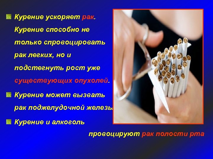 Курение ускоряет рак. Курение способно не только спровоцировать рак легких, но и подстегнуть рост уже существующих опухолей. Курение может вызвать рак поджелудочной железы Курение и алкоголь провоцируют рак полости рта