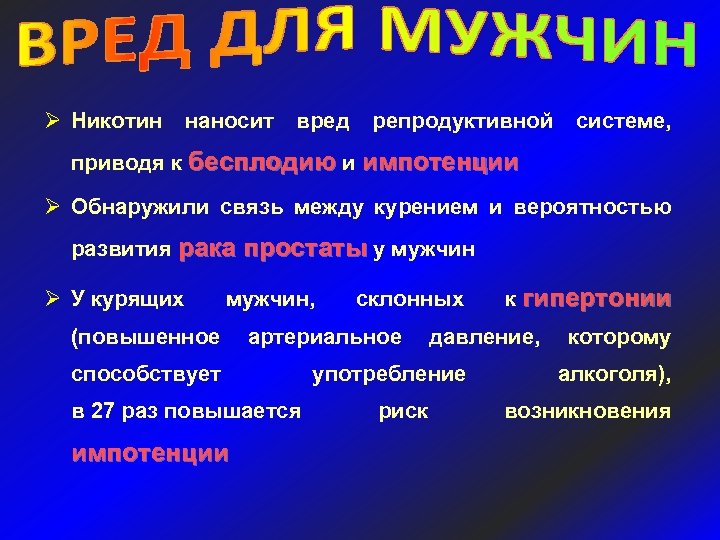 Ø Никотин наносит вред репродуктивной системе, приводя к бесплодию и импотенции Ø Обнаружили связь между курением и вероятностью развития рака простаты у мужчин Ø У курящих мужчин, склонных к гипертонии (повышенное артериальное давление, которому способствует в 27 раз повышается импотенции употребление риск алкоголя), возникновения