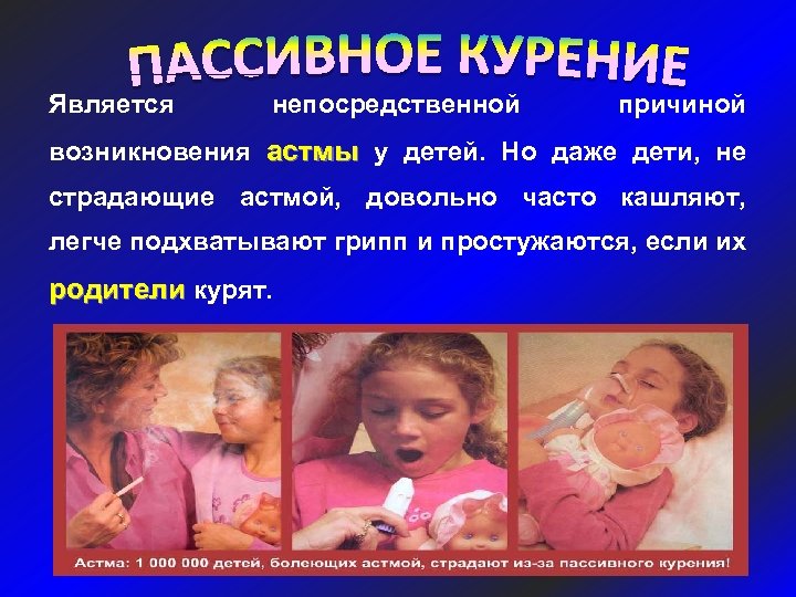 Является непосредственной причиной возникновения астмы у детей. Но даже дети, не страдающие астмой, довольно часто кашляют, легче подхватывают грипп и простужаются, если их родители курят.