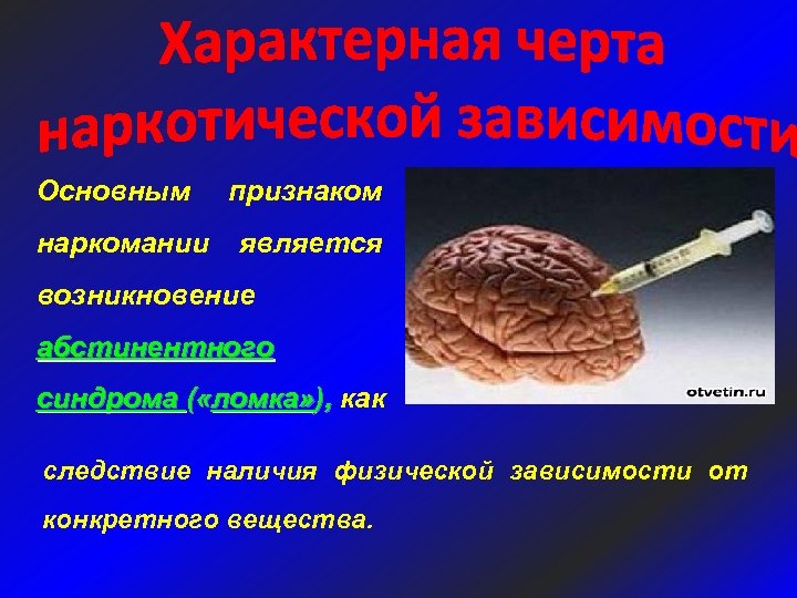 Основным наркомании признаком является возникновение абстинентного синдрома ( «ломка» ), как следствие наличия физической зависимости от конкретного вещества.