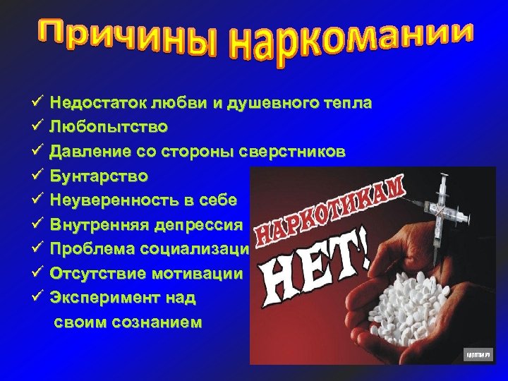 ü Недостаток любви и душевного тепла ü Любопытство ü Давление со стороны сверстников ü Бунтарство ü Неуверенность в себе ü Внутренняя депрессия ü Проблема социализации ü Отсутствие мотивации ü Эксперимент над своим сознанием