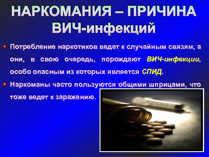 НАРКОМАНИЯ – ПРИЧИНА ВИЧ-инфекций Потребление наркотиков ведет к случайным связям, а они, в свою очередь, порождают ВИЧ-инфекции, особо опасным из которых является СПИД. Наркоманы часто пользуются общими шприцами, что тоже ведет к заражению.