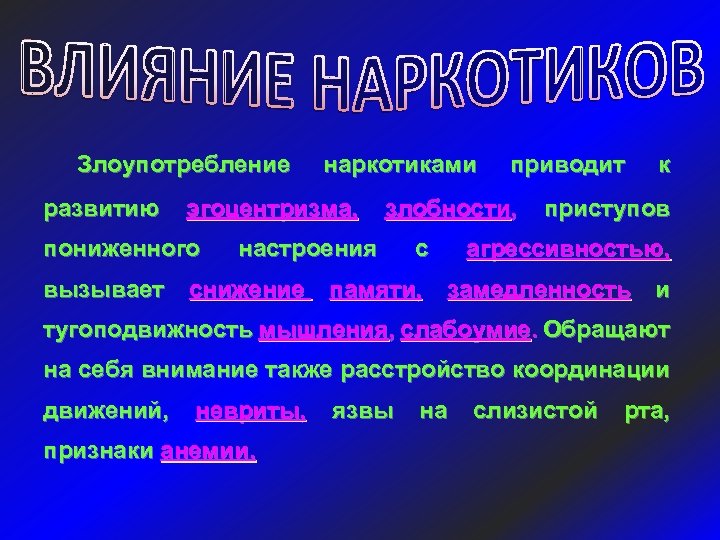 Злоупотребление наркотиками приводит к развитию эгоцентризма, злобности, приступов пониженного настроения с агрессивностью, вызывает снижение памяти, замедленность и тугоподвижность мышления, слабоумие. Обращают на себя внимание также расстройство координации движений, невриты, язвы на слизистой рта, признаки анемии.