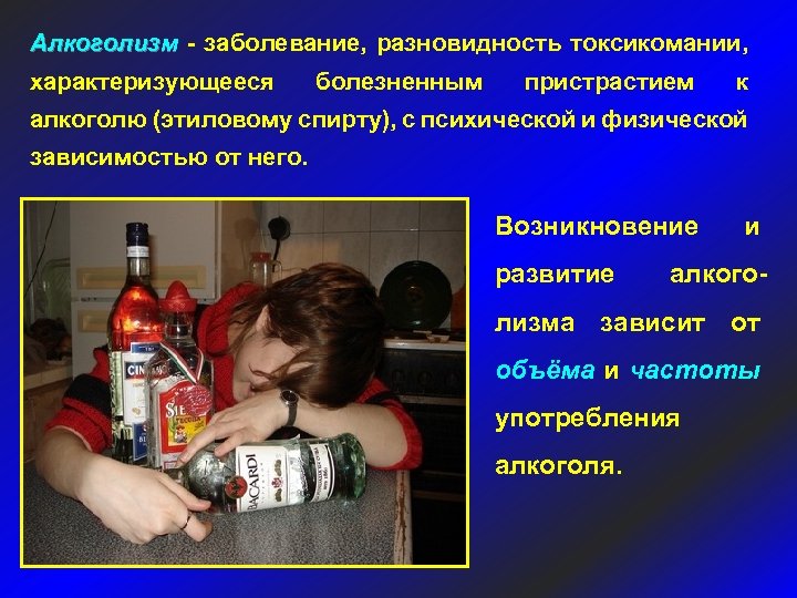 Алкоголизм - заболевание, разновидность токсикомании, характеризующееся болезненным пристрастием к алкоголю (этиловому спирту), с психической и физической зависимостью от него. Возникновение развитие и алкого- лизма зависит от объёма и частоты употребления алкоголя.