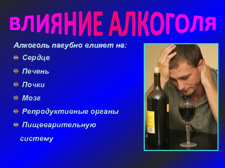 Алкоголь пагубно влияет на: Сердце Печень Почки Мозг Репродуктивные органы Пищеварительную систему