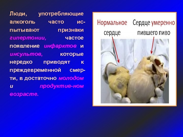 Люди, употребляющие алкоголь часто испытывают признаки гипертонии, частое появление инфарктов и инсультов, которые нередко приводят к преждевременной смерти, в достаточно молодом и продуктив-ном возрасте.