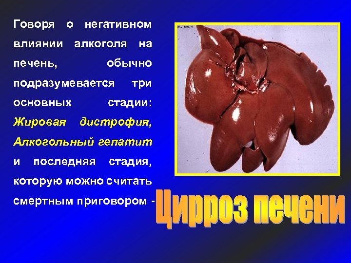 Говоря о негативном влиянии алкоголя на печень, обычно подразумевается основных Жировая три стадии: дистрофия, Алкогольный гепатит и последняя стадия, которую можно считать смертным приговором -