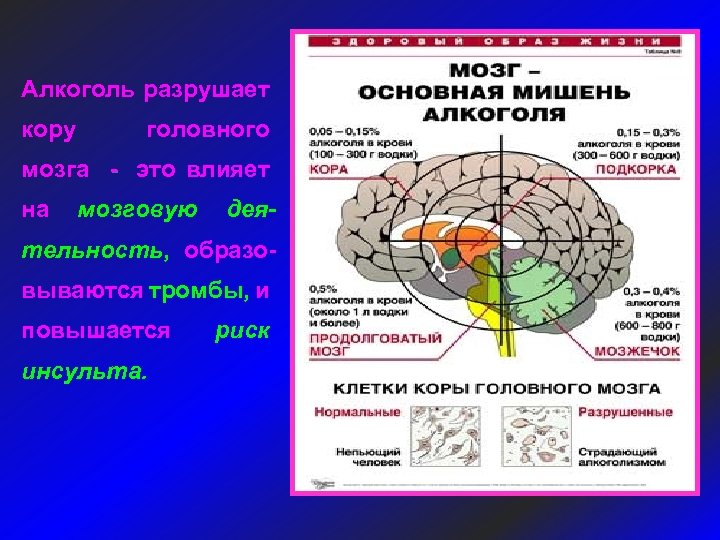 Алкоголь разрушает кору головного мозга - это влияет на мозговую дея- тельность, образовываются тромбы, и повышается инсульта. риск
