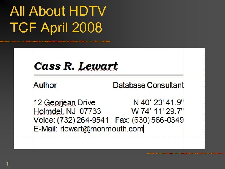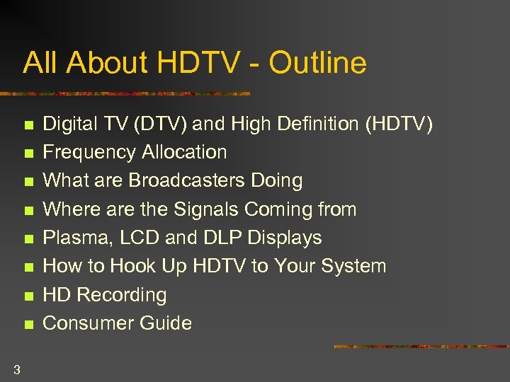 All About HDTV - Outline n n n n 3 Digital TV (DTV) and High Definition (HDTV) Frequency Allocation What are Broadcasters Doing Where are the Signals Coming from Plasma, LCD and DLP Displays How to Hook Up HDTV to Your System HD Recording Consumer Guide