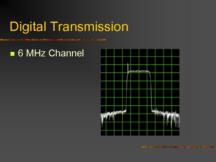 Digital TV and HDTV n n n 4 OTA Analog transmissions to cease in 2009 after over 50 years. DTV offers better picture quality – no snowy or degraded picture, no convergence problems Each pixel separately generated Stereo and surround sound (5. 1) built-in MPEG-2 compresses 1 Gb/s video stream One 6 MHz Channel can carry 20 Mbits/sec or several DTV (HDTV and SDTV) sub channels and other data (8 -VSB and QAM)