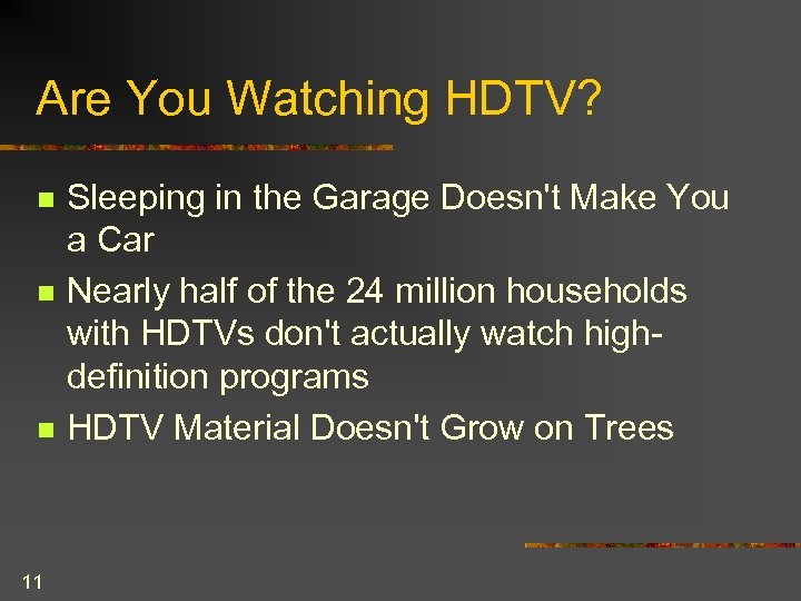 Are You Watching HDTV? n n n 11 Sleeping in the Garage Doesn't Make You a Car Nearly half of the 24 million households with HDTVs don't actually watch highdefinition programs HDTV Material Doesn't Grow on Trees