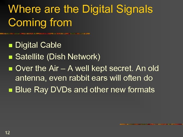 Where are the Digital Signals Coming from n n 12 Digital Cable Satellite (Dish Network) Over the Air – A well kept secret. An old antenna, even rabbit ears will often do Blue Ray DVDs and other new formats