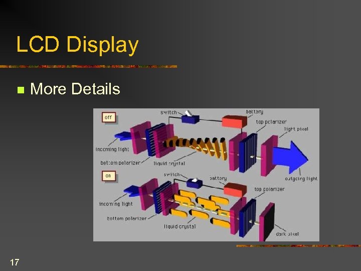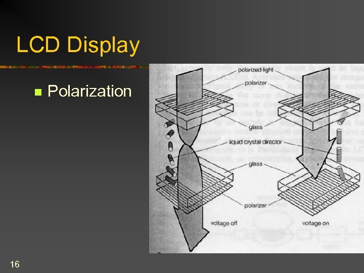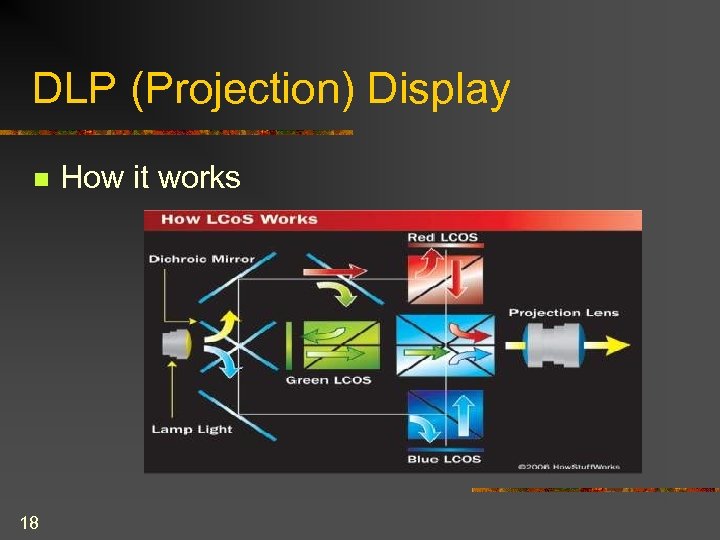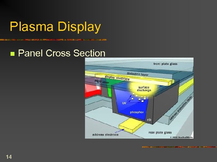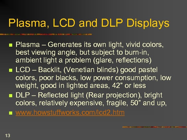 Plasma, LCD and DLP Displays n n 13 Plasma – Generates its own light, vivid colors, best viewing angle, but subject to burn-in, ambient light a problem (glare, reflections) LCD – Backlit, (Venetian blinds) good pastel colors, poor blacks, low power consumption, low weight, good in lighted areas, 42” or less DLP – Reflected light (Rear projection), bright colors, relatively expensive, fragile, 50” and up, www. howstuffworks. com/lcd 2. htm