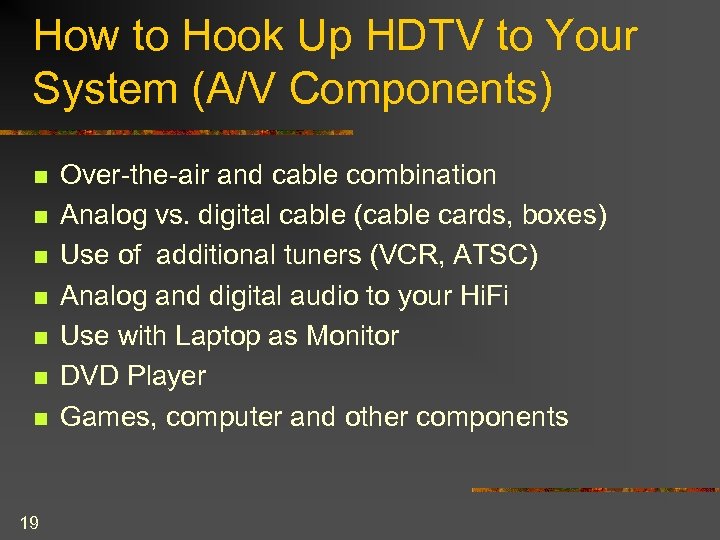 How to Hook Up HDTV to Your System (A/V Components) n n n n 19 Over-the-air and cable combination Analog vs. digital cable (cable cards, boxes) Use of additional tuners (VCR, ATSC) Analog and digital audio to your Hi. Fi Use with Laptop as Monitor DVD Player Games, computer and other components