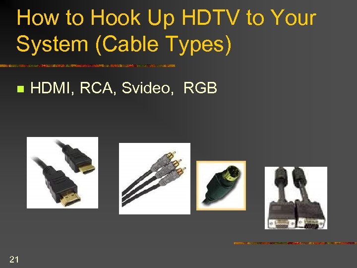 How to Hook Up HDTV to Your System (Inputs and Outputs) n n n n 20 Varies between Manufacturers and Models Composite - AVI (3 RCA cables) Component (5 RCA cables) HDMI Svideo + audio RGB (15 pins) + audio Analog Audio (Stereo) Digital Audio (5. 1)