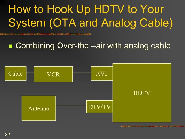How to Hook Up HDTV to Your System (OTA and Analog Cable) n Combining Over-the –air with analog cable Cable VCR AV 1 HDTV Antenna 22 DTV/TV