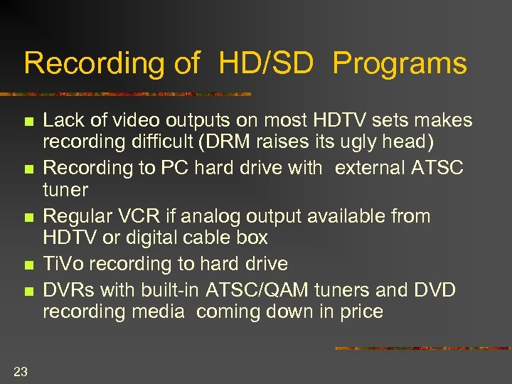 Recording of HD/SD Programs n n n 23 Lack of video outputs on most HDTV sets makes recording difficult (DRM raises its ugly head) Recording to PC hard drive with external ATSC tuner Regular VCR if analog output available from HDTV or digital cable box Ti. Vo recording to hard drive DVRs with built-in ATSC/QAM tuners and DVD recording media coming down in price