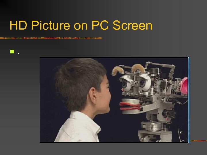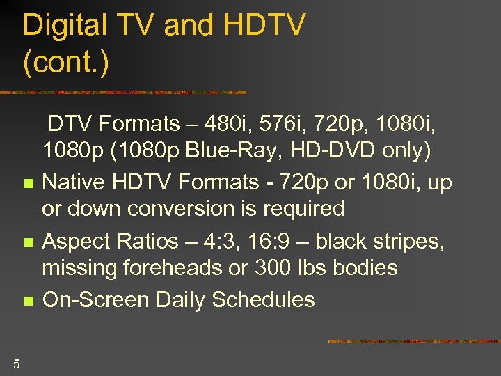 Digital TV and HDTV (cont. ) n n n 5 DTV Formats – 480 i, 576 i, 720 p, 1080 i, 1080 p (1080 p Blue-Ray, HD-DVD only) Native HDTV Formats - 720 p or 1080 i, up or down conversion is required Aspect Ratios – 4: 3, 16: 9 – black stripes, missing foreheads or 300 lbs bodies On-Screen Daily Schedules