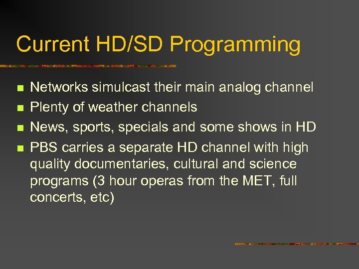Current HD/SD Programming n n Networks simulcast their main analog channel Plenty of weather channels News, sports, specials and some shows in HD PBS carries a separate HD channel with high quality documentaries, cultural and science programs (3 hour operas from the MET, full concerts, etc)