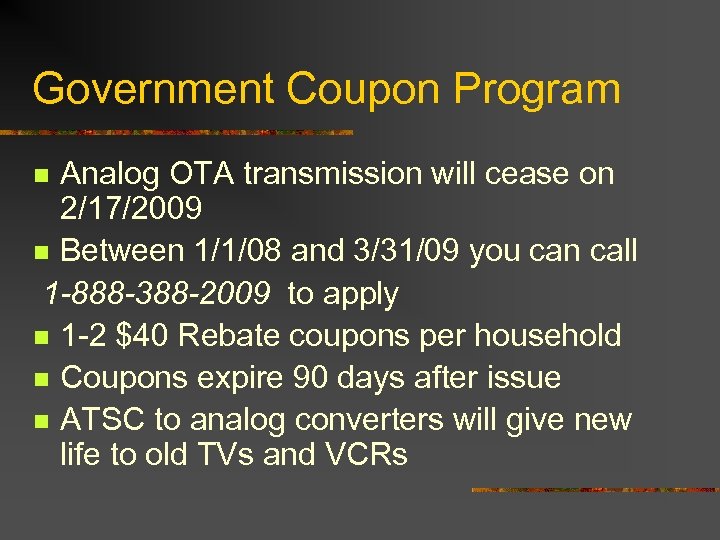Government Coupon Program Analog OTA transmission will cease on 2/17/2009 n Between 1/1/08 and 3/31/09 you can call 1 -888 -388 -2009 to apply n 1 -2 $40 Rebate coupons per household n Coupons expire 90 days after issue n ATSC to analog converters will give new life to old TVs and VCRs n