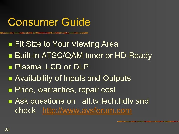 Consumer Guide n n n 28 Fit Size to Your Viewing Area Built-in ATSC/QAM tuner or HD-Ready Plasma. LCD or DLP Availability of Inputs and Outputs Price, warranties, repair cost Ask questions on alt. tv. tech. hdtv and check http: //www. avsforum. com